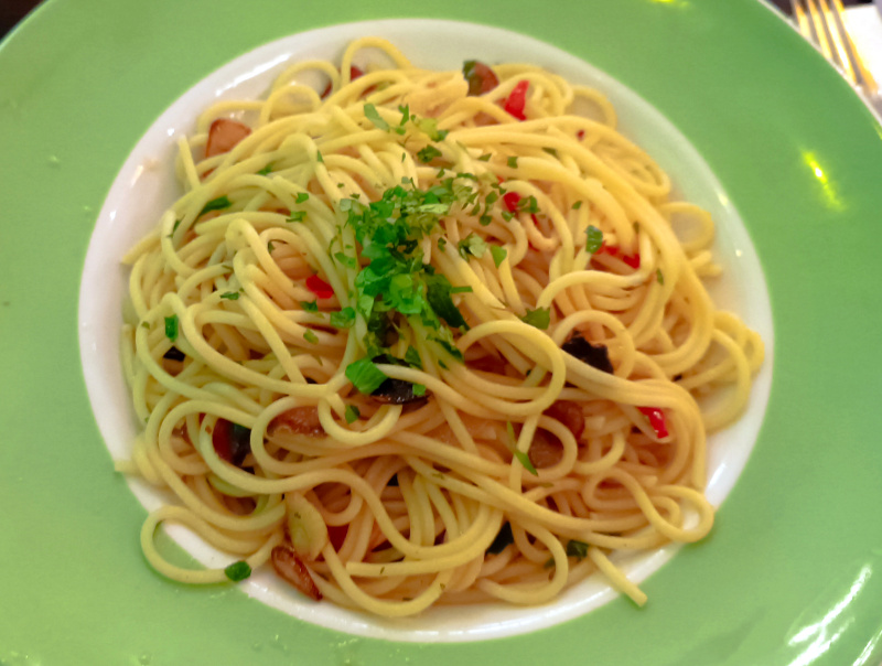 Kulinarischer Wochenhöhepunkt (ja, der Geschmackssinn ist größtenteils wieder da, ich sitze mit Messer und Gabel wieder im Sattel) war eine delikat-rustikale Fisch-Tapas-Platte im Tapas Espana. Das Foto hab ich im einigermaßen dusteren Gastraum verwackelt, deshalb gibt’s den Runner-Up im Bild, Spaghetti aglio, olio e peperoncini im Fellini (fast so gut wie meine unschlagbaren Selbstgeklöppelten).