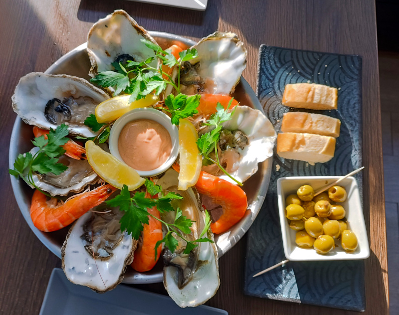 … für mich die Austern, für die beste, geduldigste Gemahlin von allen die Crevetten, dazu reichlich Weißbrot und Weißen, hach ja, Gott lebt auch in Freidrichshagen wie in Frankreich.