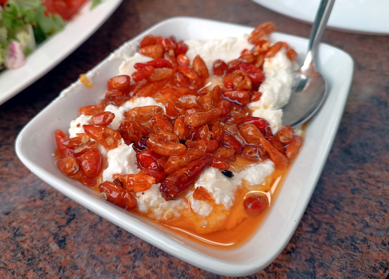 Stelle mir das im Sommer fein vor, eisgekühlt der Yoghurt und darauf die lauwarmen geölten Chilis.