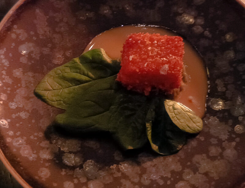 … obigen wacker gegen das Schummerlicht ankämpfenden knusprigen Maisflan, gebackene Panisse und Schwarze Johannisbeere mit Käsekuchencreme. Sophia Rudolph lieferte wieder ganz großes Küchen-Tennis, ihr raffinierter Umgang mit Säure-Nuancen ist einzigartig und macht einen Heidenspaß.