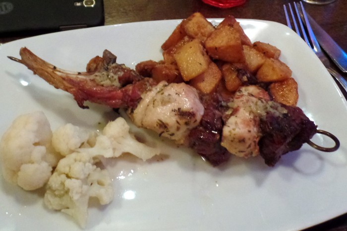 Kulinarischer Höhepunkt der Woche war die Entdeckung des Restaurants Le Samson ebendort.  Laut Website griechisch-französisch, aber das griechische Element beschränkt sich auf die Moussaka bei den Hauptgerichten und einen Vorspeisenteller. Der Chef kocht traditionell französisch, und wie! Ich hatte Schnecken in Kräuterbutter, den unten abgebildeten Spieß des Hauses mit sen-sa-tio-nellen Knoblauchkartoffeln und Creme Brulée. Vom nebenan verspiesenen Boeuf Bourguignon durfte ich kosten: Klasse! Empfehlung! Drei-Gang-Menü übrigens für 18 Euro.