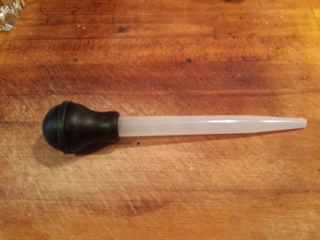 Beim Blick in die Küchenschublade entdeckte ich, dass der gelbe Gummi-Bollo meiner Bratenspritze (unverzichtbares Küchenrequisit u. a. für das Begießen von Gänsebraten) fehlte. Nach einer mehrtägigen, intensiven Suchaktion entdeckte die beste, geduldigste Gemahlin von allen den fehlenden Gummi-Bollo in besagter Küchenschublade. Ich hatte ihn übersehen, weil er schwarz war statt gelb. Der gelbe Bollo gehörte zu einer Bratenspritze, die vor ein paar Jahren das Zeitliche gesegnet hatte.