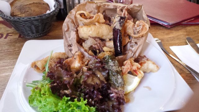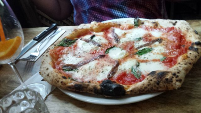 Am Freitagnachmittag wollten die geduldigste, beste Gemahlin von allen und ich das Wochenende mit einem Impuls-Apero beim Italiener jejenüber vonne Arbeet einläuten. Doch der war ankündigungslos in Urlaub gefahren. Mählich mäanderten wir Richtung Friedenau als die jeduldigste Jemahlin mit der ihr eijenen jeistijen Klarheit vorschlug, doch endlich den „neuen Italiener“ (seit ca. 1 Jahr) im ehemaligen Tomasa inner Hauptstraße auszuprobieren. Vorjesacht, nachjemacht. Die Pizza sieht so aus …