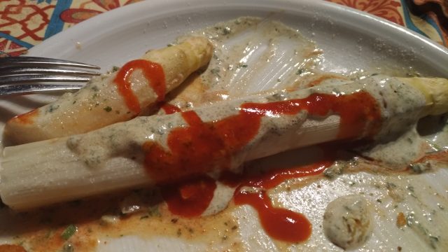 Damit, dass ich Spargel mit Joghurtsauce zu Fischstäbchen gegessen habe, habe ich für eine gewisse Aufregung gesorgt. Gottseidank habe ich verschwiegen, dass ich mir auch noch Sriracha-Sauce über das Gemüse gekippt habe. Da wäre ja die Hölle los, wenn das bekannt würde.
