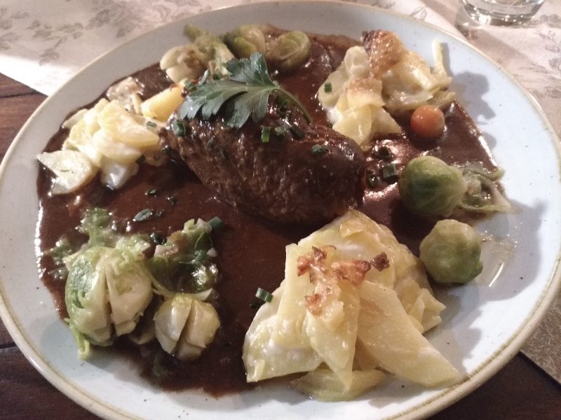 Kulinarischer Wochenhöhepunkt: Sensationelle Roulade vom Büffel im endgültig höchstgeschätzten Restaurant Hermanns in Jüterbog. Man hat sich dort durch hervorragende fein gemachte bürgerliche Küche und einen außergewöhnlich kenntnisreichen Service (infame Methoden!) endgültig in mein verfressenes Herz geschlichen.