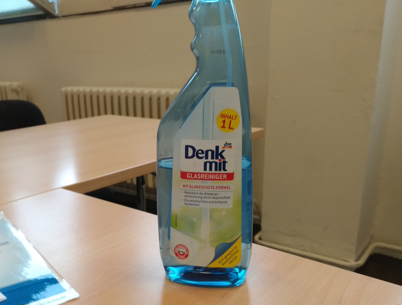 Welcher merkbefreite Marketing-Idiot kommt auf die Idee, einen Glasreiniger „Denk mit“ zu nennen. Oder soll das eine Anregung sein, die Mutter aller Verschwörungstheorien entwickeln? „Mein Gott, wer hätte denn gedacht, das ausgerechnet der Glasreiniger übernehmen würde?“