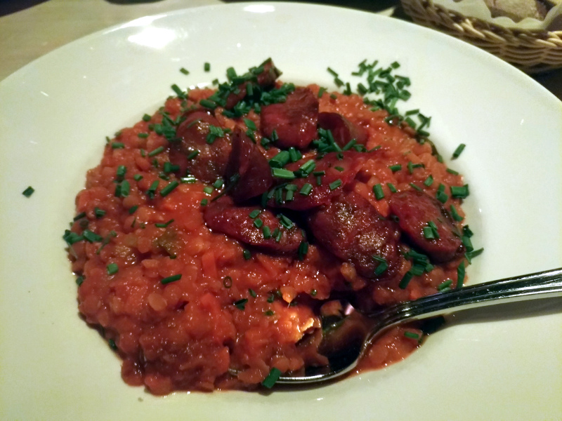 Der kulinarische Wochenhöhepunkt ist diesmal eine fotografische Mogelpackung. Die abgebildete, ausgezeichnete Linsensuppe mit KReukümmel, Knoblauch und chön charfer Chroizo aus dem Steglitzer Hoppegartem war nämlich nur der Runner-Up. Unangefochtener Sieger war mein derzeitiges Lieblings-Soulfood, Filetto Gorgonzola im Mare Monte. Dieses Gericht ist aber leider unfotografierbar. Nehme ich es auf, wie es vor mich hingestellt wird, sieht man lediglich einen undefinierbaren Klops unter weißer Sauce. Schneide ich es aber an, vergesse ich mich und esse das wunderbar medium rare gebratene Filet und die Gorgonzolasauce ratzfatz auf, bevor ich mich daran erinnere, dass ich das Gericht ja eigentlich fotografieren wollte.