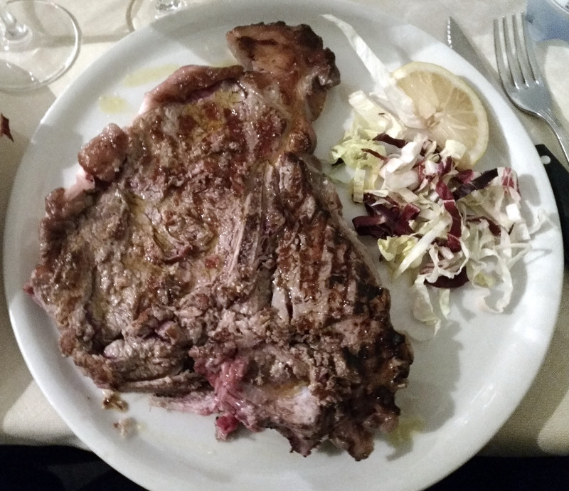 Kulinarischer Wochenhöhepunkt: Bistecca Fiorentina, vor Ort. Blutig.