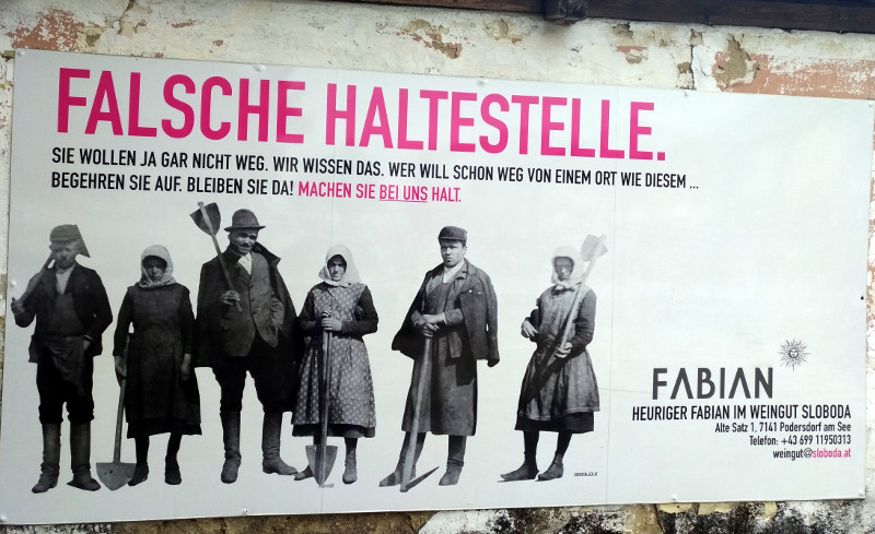 Diese Werbung für den trefflichen Heurigen „Fabian“ haben die Inhaber direkt an der Bushaltestelle in Podersdorf platziert, wo man auf den Bus Richtung Heimat warten muss. Sie spiegelte perfekt meine Gemütslage beim Verlassen des Lieblingsorts wieder. Ich wollte da nicht weg.