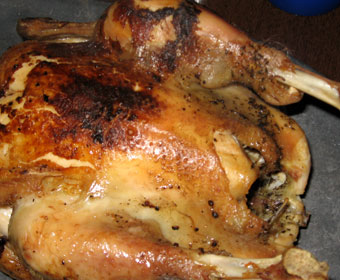 Huhn kurz raus aus dem Topf, Fett abgießen, die 40 Knoblauchzehen anschwitzen, mit einem Schuss Weißwein (soll nur ganz wenig Flüssigkeit im Topf stehen) ablöschen, Huhn wieder in den Topf, dicht schließenden Deckel drauf und ab in den Ofen der so 140, 160 Grad (Gas 3) haben sollte. Wenn‘s im Topf braust oder brodelt, ist dem Huhn zu heiß! Nach 30, 40, 50 Minuten im Ofen (je nach Größe des Huhns) nimmt man den Deckel ab, lässt noch eine Viertelstunde bräunen und das war‘s. Das Huhn sollte jetzt in etwas so wie auf dem Bild aussehen. Dann läßt man es noch zehn Minuten ausruhen, bevor man es tranchiert.