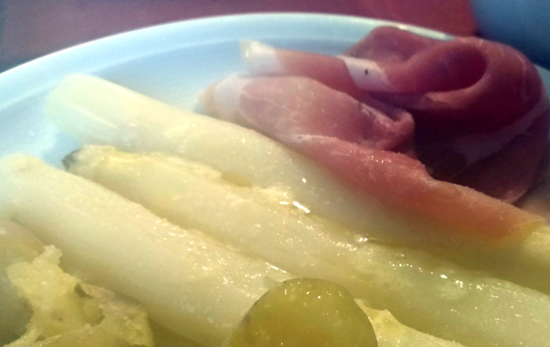 Kulinarischer Wochenhöhepunkt war wunderbarer weißer Spargel, ganz klassisch mit Kartoffeln, Schinken und zerlassener Butter. Die Grie Soß, die es anderntags zum gekochten Rindfleisch gab, musste sich knapp geschlagen geben.