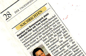 Bisher erschöpfte sich das Tagwerk des Journalisten in sturer Welterklärerei und dem schnöden, banalen Berichten über tatsächliche Vorfälle. Aber heute hatte der Tagesspiegel – ausgerechnet der Tagesspiegel, mir steigen die Tränen der Rührung ins Auge – den Mut, über ein Ereignis zu berichten, dass vielleicht geschehen wird. Vielleicht wird Grobian Donner von Henkelmann im neuen Tom-Cruise-Film Regie führen. Vielleicht dreht er aber auch ein Familienvideo, in dem seine Kinderchen in schmucken Biene-Maja-Kostümen brummend durch den Garten laufen. Vielleicht nimmt er seine Kamera aber auch mit in ein Motelzimmer, wo ein hoher Formel-1-Funktionär… ab heute ist einfach alles möglich.
