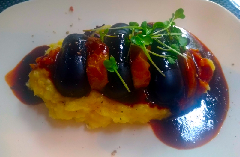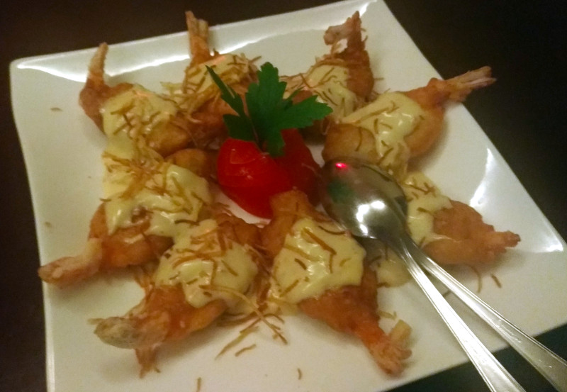 Da wir uns die köstlichen Gerichte teilten, ist es mir nur gelungen, eins „unversehrt“ vor die Kamera zu bekommen, die Großgarnelen in Bierteig mit Wasabi-Mayonnaise:
