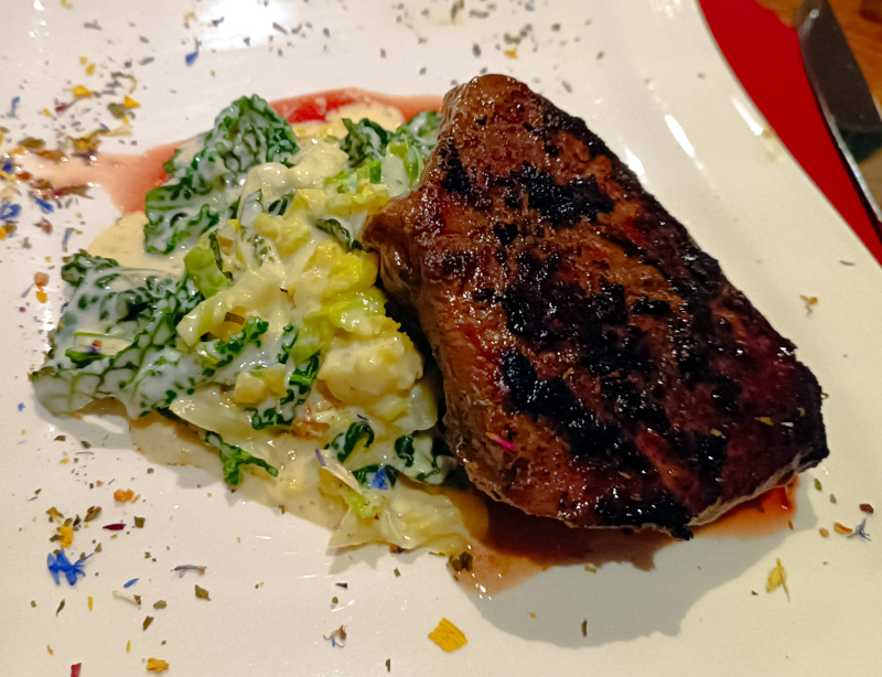 Kulinarischer Wochenhöhepunkt war ein rosa gebratener Hirschrücken mit Rahmwirsing, Portweinsauce und Steinpilzrisotto (die beiden letztgenannten hätten – auf Extratellern serviert – die Bildkomposition schimpfliert und wurden daher nicht fotografiert) im sehr empfehlenswerten Restaurant „klein und fein“ in Binz.
