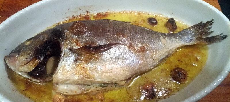 Kulinarischer Wochenhöhepunkt war eine Knoblauch-satte Cinemascope-Goldbrasse aus dem Ofen…