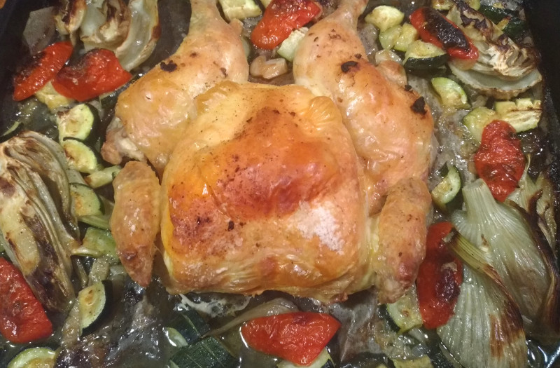 Zwei kulinarische Wochenhöhepunkte. Nummer 1 eröffnete die Woche am Sonntagabend, ein geplättetes Huhn, ohne Umschweife mit Knoblauch, Gemüse und griechischem Olivenöl eine Stunde lang
