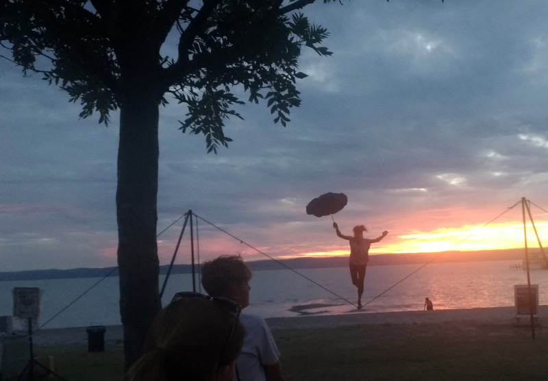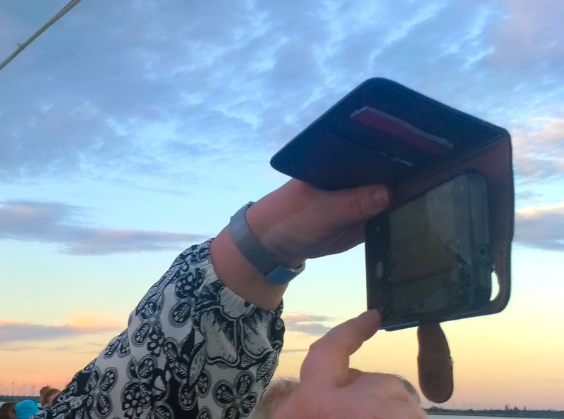 Kapitän Knoll von der „Knoll Schifffahrt“ schippert bei diesen Fahrten 2 Winzer und einen Haufen durstiger Urlauber durchs Schlammloch auf den Sonnenuntergang zu, der meist pünktlich nach der Verkostung des fünften Weins erfolgt. Da die Winzer die Proben großzügig einschenken, können wir bestätigen, dass jede dieser Seefahrten ausgesprochen lustig ist. Wenn besagter fünfter Wein das Glas verlassen hat, schlägt die Stunde der besten, geduldigsten Gehmalin von allen, denn dann fotografiert sie den Sonnenuntergang, und ich fotografiere sie…