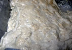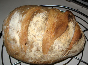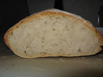 BrotteigAm nächsten Tag sah der Teig so aus. Dachte ich’s mir doch. Viel zu klebrig. Das gibt nix! Andererseits… man soll ihn ja gar nicht kneten, vielleicht geht’s ja doch. Hände eingemehlt, Teigstück abgenommen und – ohne zu kneten – zu sowas wie einer Kugel geformt, und auf ein Stück Backpapier gesetzt (überflüssige Vorsichtsmaßnahme). Hmmpf. Ging ja doch. War gar nicht klebrig, sah bloß so aus. 40 Minuten gehen lassen, während der Zeit den Backofen nebst Backstein vorheizen (volle Pulle). Teigkugel bemehlstäubt, eingeschnitten, auf den Backstein geschoben, Tasse Wasser in die Saftpfanne, zisch, zosch, Ofentür zu, Hitze runter (bei meinem ollen Gasherd auf 4), 40 bis 50 Minuten gewartet. Immer noch skeptisch. Das KANN nix geben.