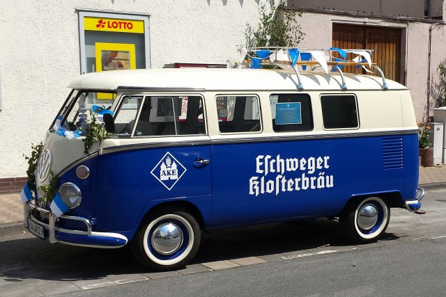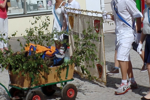 Die Schulfahne der Friedrich-Wilhelm-Schule beim Maien-Zug. Auch ich hatte mal das höchst zweifelhafte Vergnügen, sie zu tragen. Nicht zu zweit, wie das heutzutage gemacht wird. Allein. An einer langen, schweren Fahnenstange. Von Eschwege nach Grebendorf und zurück. Eine der sinnlosesten Aktionen, an denen ich je teilgenommen haben.