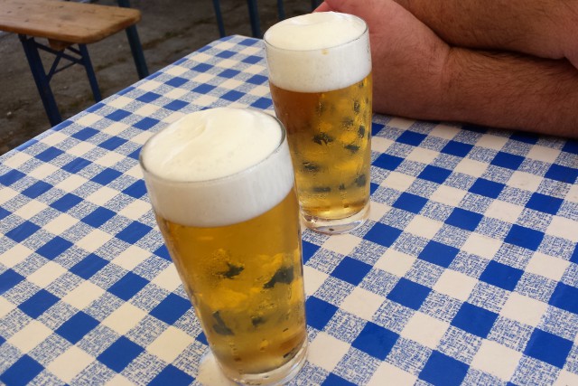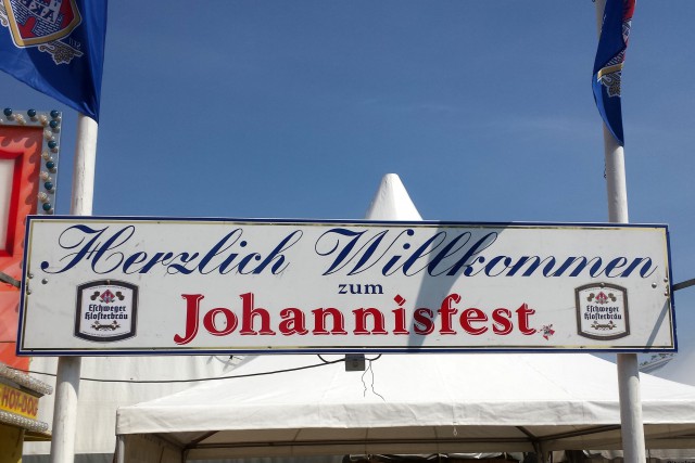 Die Johannisfest-Reiter erfrischen sich vor dem Traditionslokal „Zur Struth“. Wie die Tradition es erfordert, wird die Erfrischung aus kleinen Gläsern und mehrfach zu sich genommen.