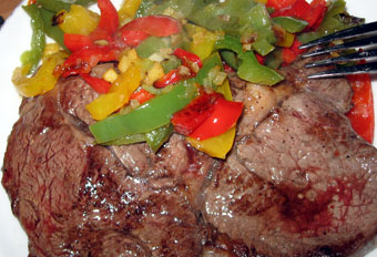 Stattdessen kochte ich Ingwer-Chili-Paprikagemüse. Das macht man genauso wie Ingwer-Chili-Gurken, nur dass man statt der Gurken Paprikaschoten nimmt. Geht genauso unkompliziert und fix wie die Gurken. Schmeckt ähnlich lecker. Das kleine Stückchen Entrecote auf dem Teller ist übrigens eine ganz delikate Ergänzung zu jeder vegetarischen Mahlzeit.