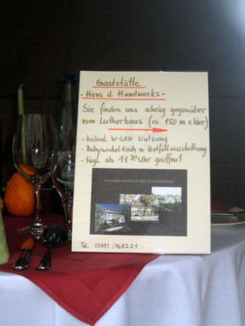 Geradezu vorbildlich macht die Gaststätte „Haus des Handwerks“ in Lutherstadt Wittenberg auf ihre Alleinstellungsmerkmale aufmerksam: Touristen-freundliche Öffnungszeiten, Nähe zu den lokalen Sehenswürdigkeiten, kostenloses W-Lan und einen Wickeltisch mit Notfallausstattung.