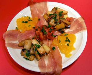 Den gebratenen Spargelsalat lauwarm mit je drei Scheiben Parmaschinken und einem Häufchen geÂhackten Orangengelee und etwas Tomatenconcassé anrichten.